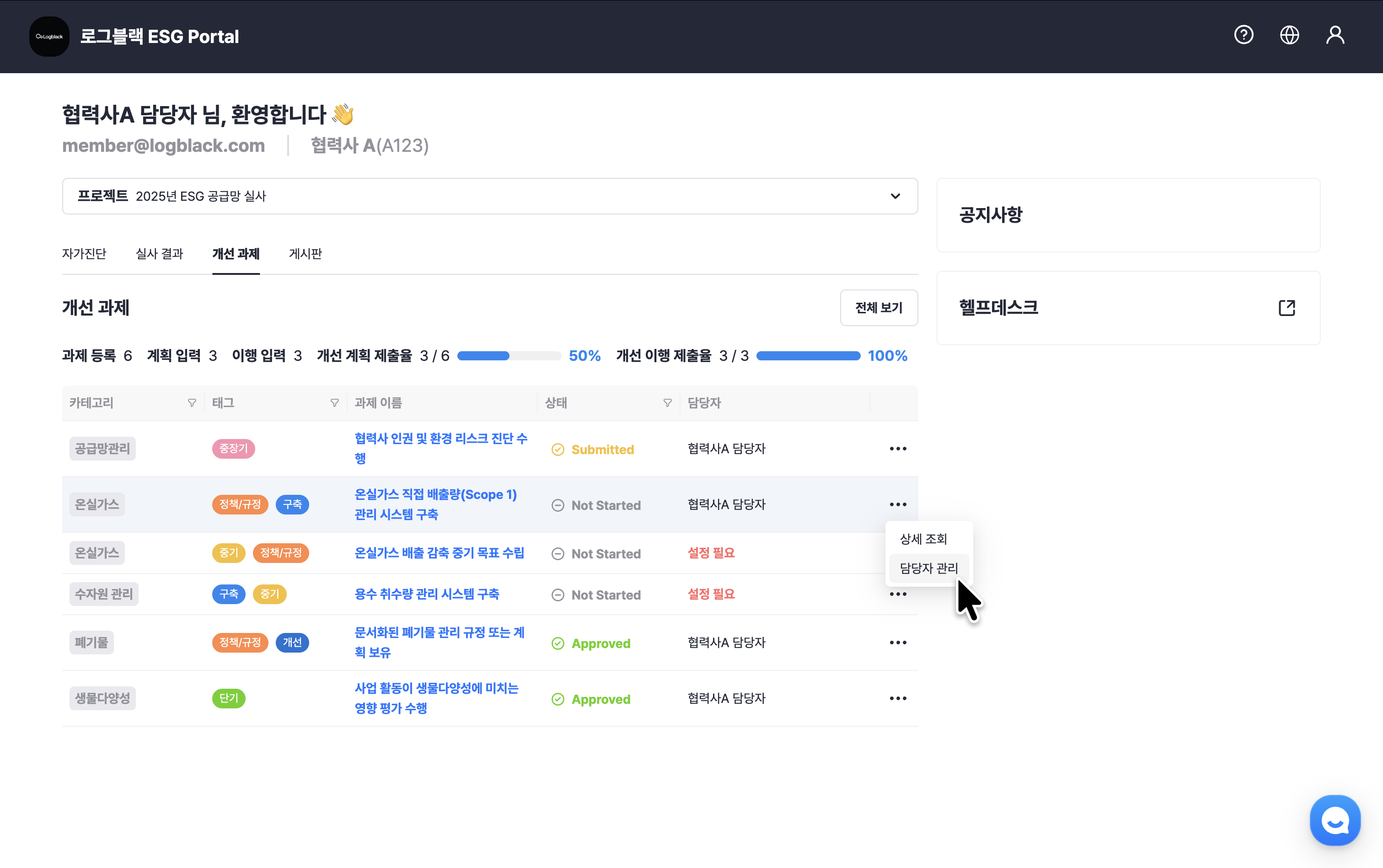 개선 과제 담당자 지정하기개선 과제의 담당자를 지정합니다.개선 과제 테이블에서 "담당자 관리" 버튼을 누릅니다.담당자 이름을 검색하고, 저장합니다.담당자는 여러 명 지정할 수 있습니다.개선 과제 화면