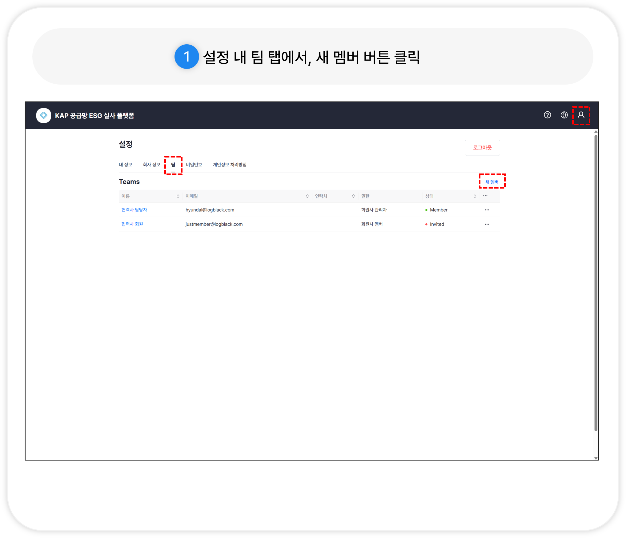 설정 내 팀 탭에서 새 멤버 버튼을 클릭합니다.