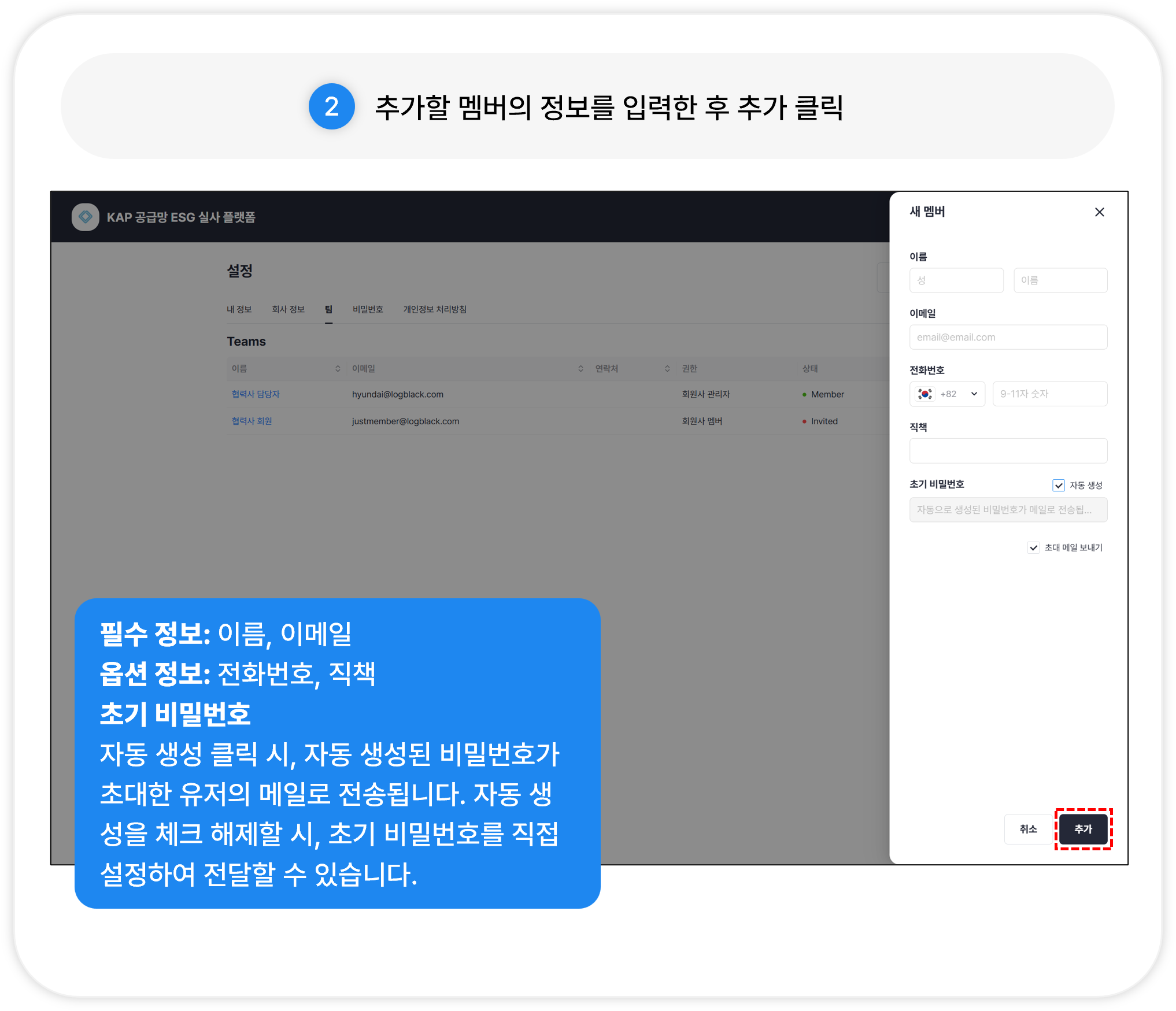 추가할 멤버의 정보를 입력한 후 추가 버튼을 클릭합니다.