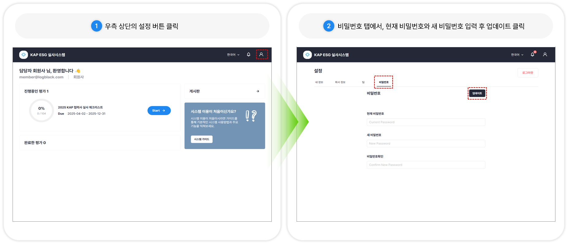비밀번호 탭에서, 현재 비밀번호와 새 비밀번호 입력 후 업데이트 클릭