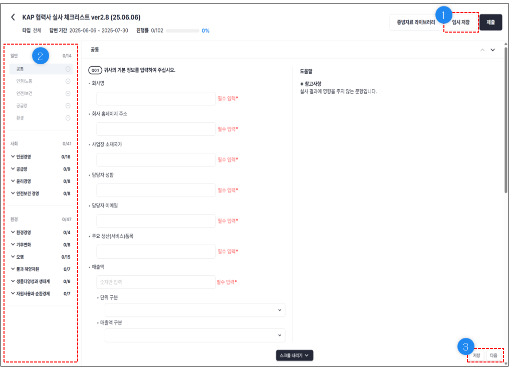 현재 화면에서 다른 지표로 이동할 경우, 해당 화면에 입력한 답변은 자동으로 저장됩니다.예를 들어, ② 다른 지표를 클릭하거나, ③ 이전/다음 버튼을 클릭하는 경우에 자동으로 저장됩니다.