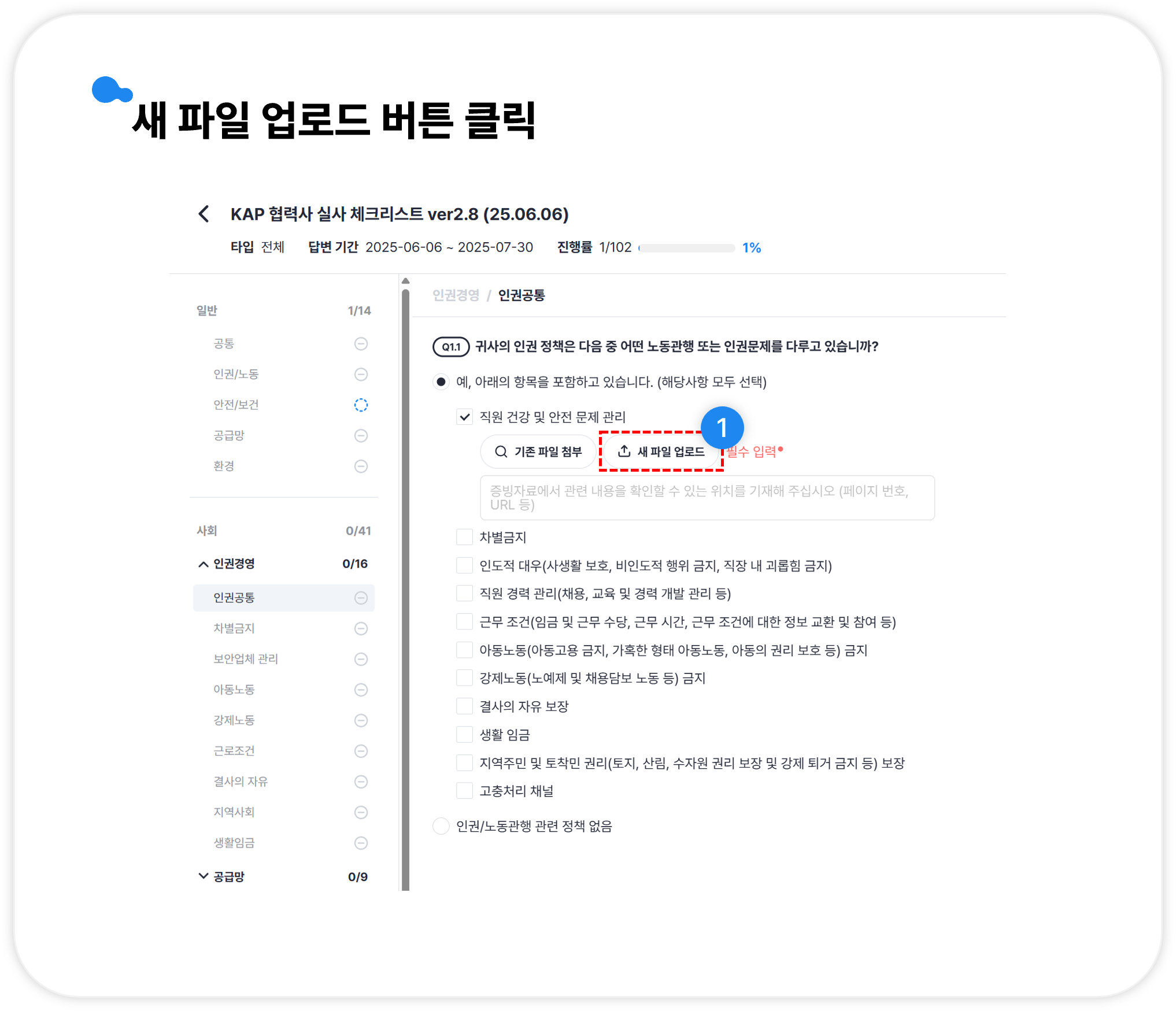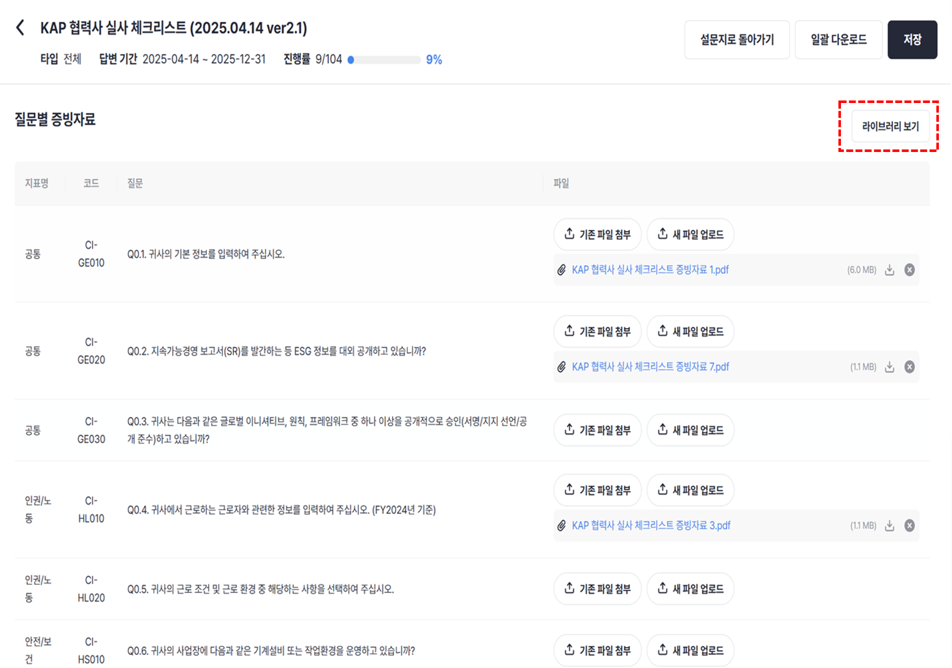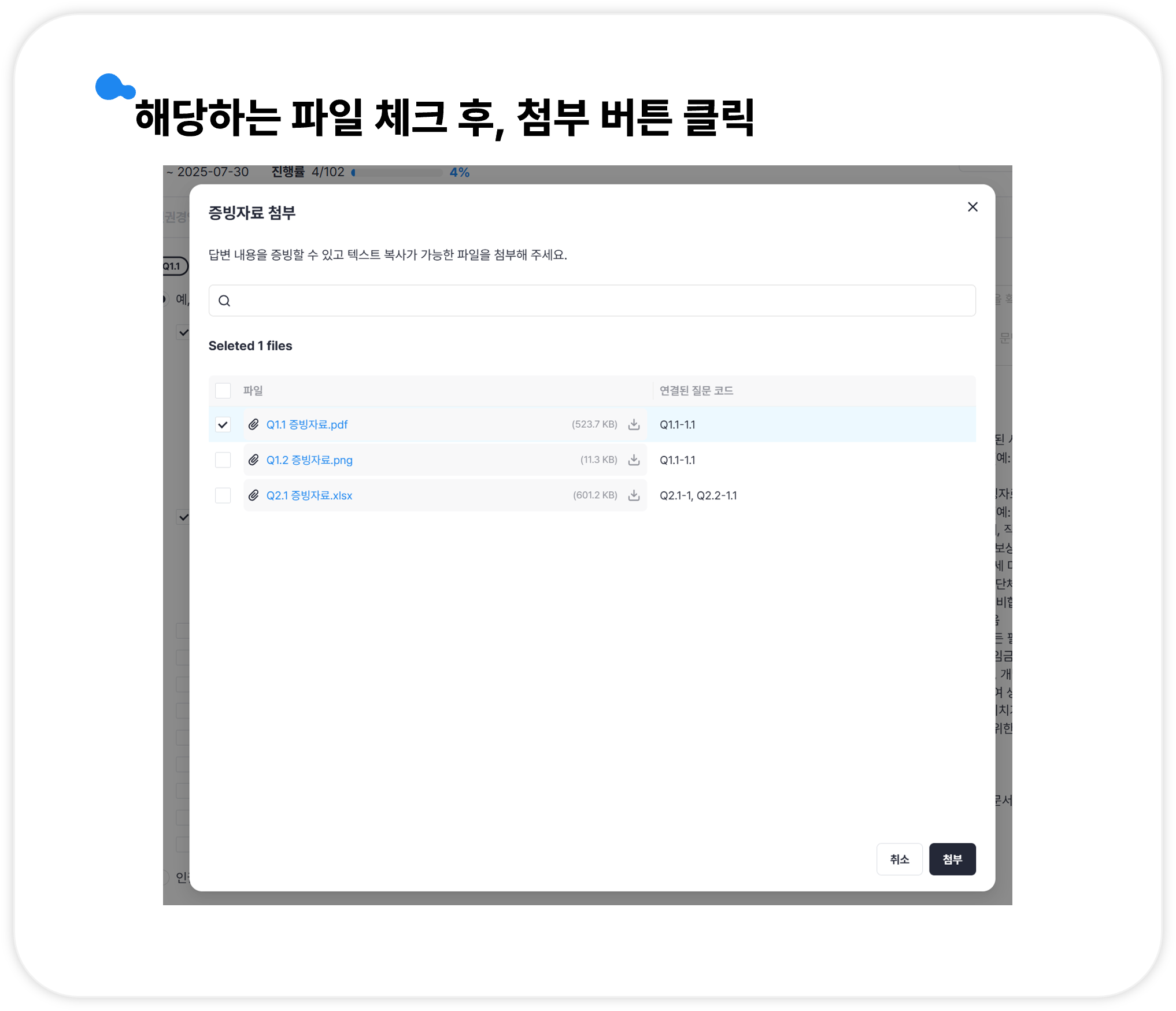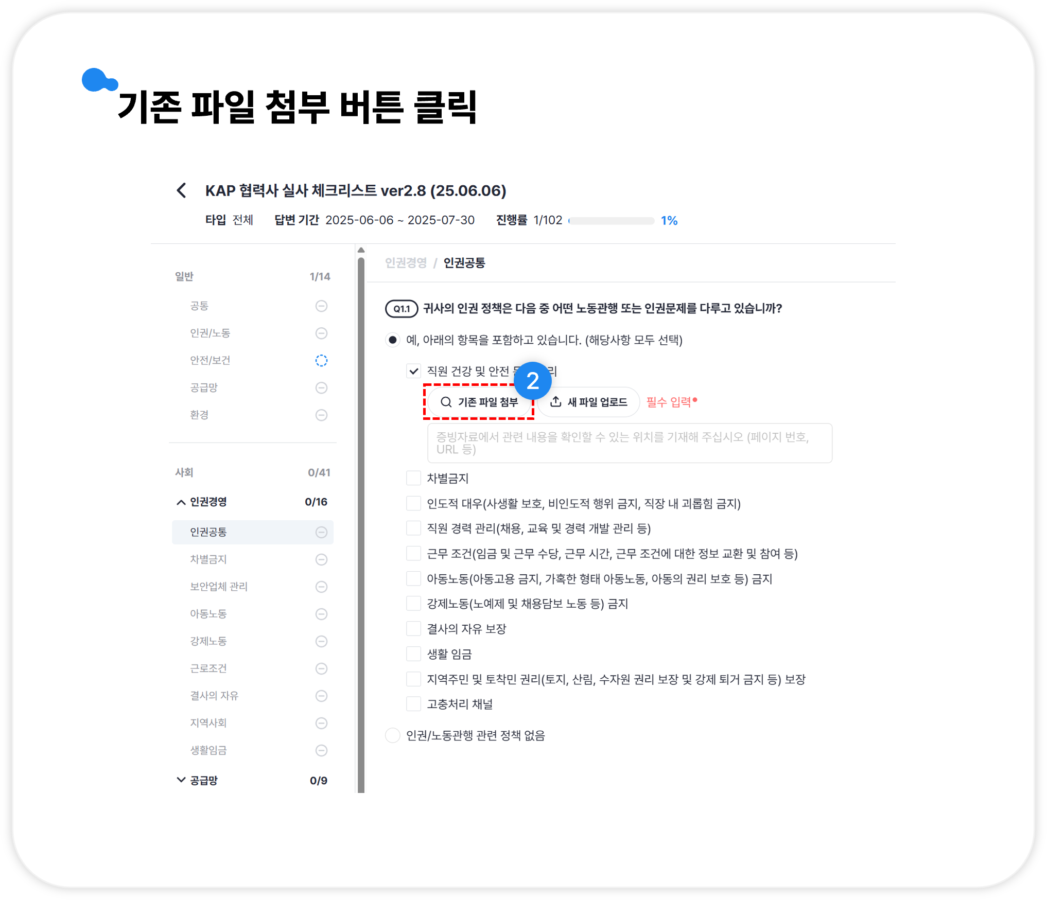 하나의 증빙자료를 여러 문항에서 사용하는 경우, 기존 파일 첨부 기능을 이용할 수 있습니다.